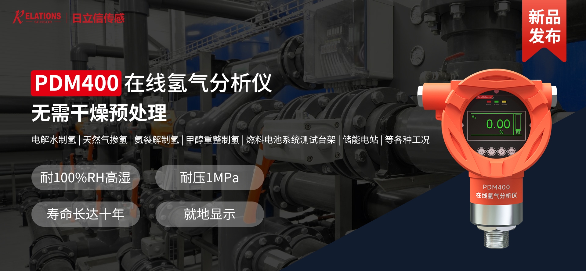 電解水、天然氣、氫分裂制氫,輸氫管道、氫氣置換,制氫站、加氫機、卸氣柱、撬裝站、氫燃料電池汽車及系統(tǒng)測試臺架、熱電聯(lián)供、氫滲氫實驗室、涉氫生產(chǎn)廠房、氫氣氣瓶間等場合中的氫氣濃度、純度、濕度檢測。